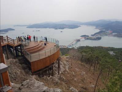주변에는 편백숲, 초양대교, 창선삼천포대교, 각산봉화대, 죽방렴 등 다양한 명소가 위치해 있으며, 남해의 푸른 바다까지 볼 수 있어 전망이 매우 좋습니다.