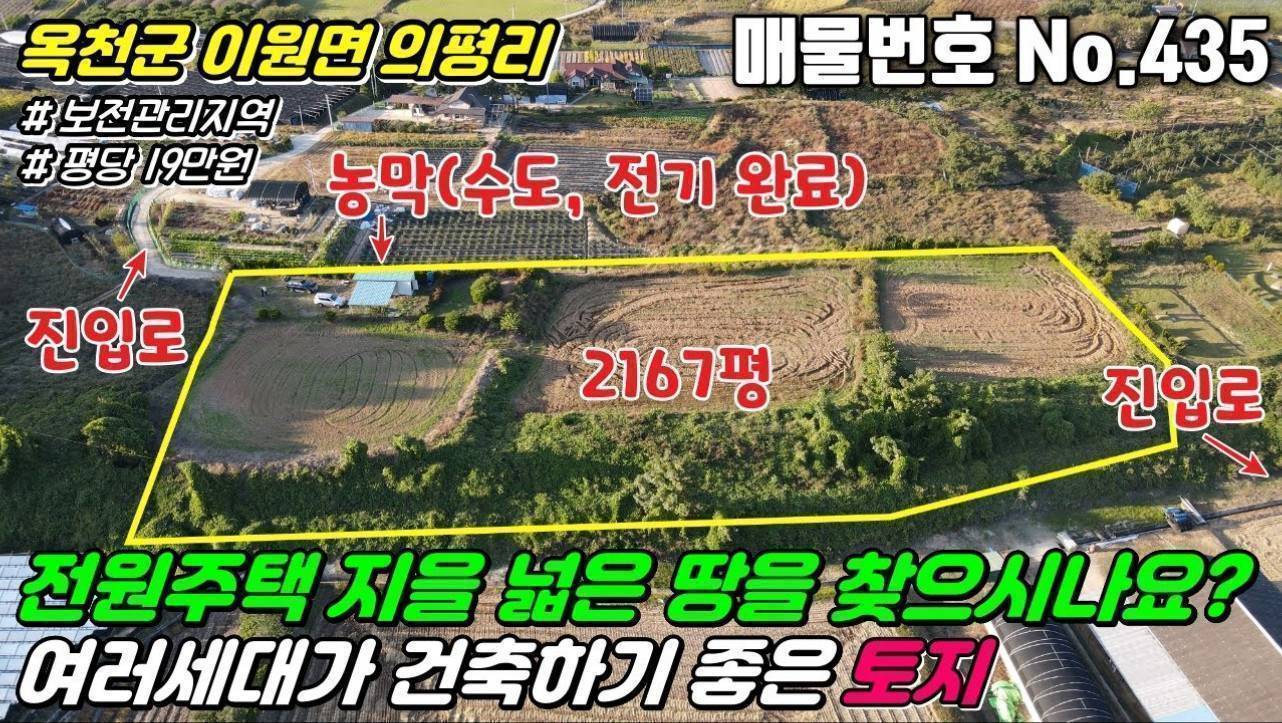 대한민국 충청북도 옥천군 이원면 의평리입니다. 이 지역은 주로 농업 활동이 이루어지는 평야와 작은 산 foothills가 교차하는 곳으로, 기후와 토양이 농작물 재배에 매우 적합합니다. 의평리 주변에는 아름다운 자연 경관이 펼쳐지며, 계절에 따라 다양한 색감의 들판과 산들이 이 지역의 매력을 더욱 돋보이게 합니다.